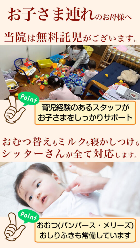 キッズスペースもありオモチャやDVDもご用意しているので、お気軽にお越しください。当院は無料託児付きです。女性ベビーシッターも在籍しているため、お子さまの子守をご希望の方はお問い合わせくださいませ。